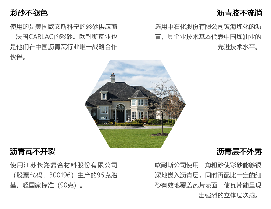 - 彩砂不褪色使用的是美國(guó)歐文斯科寧的彩砂供應(yīng)商--法國(guó)CARLAC的彩砂。歐耐斯瓦業(yè)也是他們?cè)谥袊?guó)瀝青瓦行業(yè)唯一戰(zhàn)略合作伙伴。CARLAC的彩砂經(jīng)過(guò)800度以上的高溫?zé)Y(jié)而成,顏色鮮艷穩(wěn)定,不易褪色。